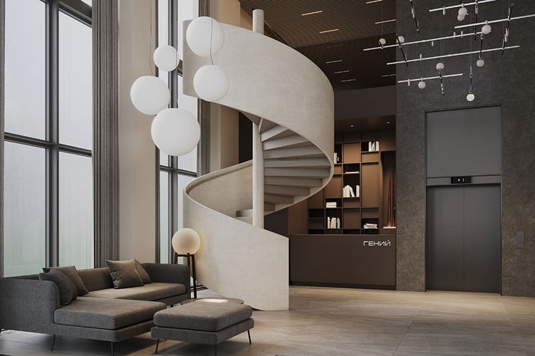 Довольно необычно, что соседнее с ЖК “Гений” здание - Санкт-Петербургский Государственный университет Телекоммуникаций имени профессора М. А. Бонч-Бруевича. Это и сказалось на концепции ЖК. Каждый корпус посвящен одной из 6 ключевых сфер: физике и машиностроению, химии и строительству, информатике, промышленному дизайну, творчеству и исследованиям космоса.