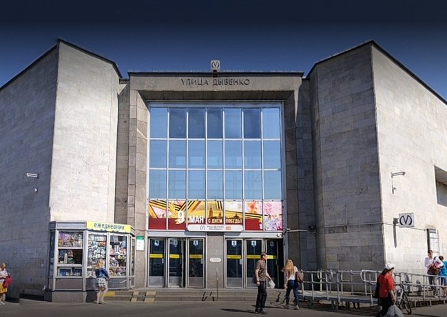Расположена в 10 минутах ходьбы. Соседнее со станцией здание - ТРК "Невский", а за ним расположен парк Есенина